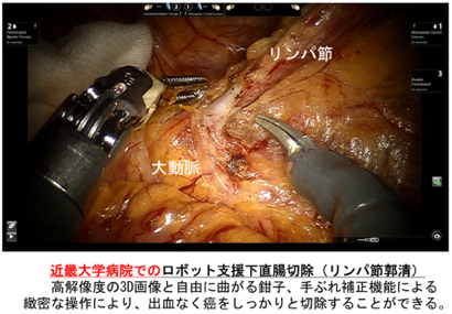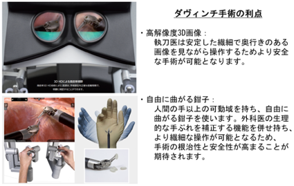 ダヴィンチ手術の特徴は、高解像度の3D画像、多関節をもった自由に曲がる鉗子、手振れ補正機能などによるより精緻な手術操作にあります。それにより技術的に難しいとされる直腸がん手術において、がんの根治性と排便・排尿・性機能など術後機能温存の両立が可能になることが期待されます。
