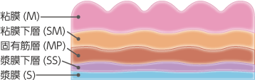 - 胃はみぞおちのあたりに位置しており,食道と十二指腸の間にある臓器です。食道と十二指腸の間の短い方を小弯(しょうわん),長い方を大弯(だいわん)と言います。胃は口側(食道との境)から順に胃底部(胃穹窿部(いきゅうりゅうぶ))、胃体部、幽門部と呼ばれます。また,胃壁は内側から粘膜層(ねんまくそう)(M),粘膜筋板(ねんまくきんばん)(MM),粘膜下層(ねんまくかそう)(SM),固有筋層(こゆうきんそう)(MP),漿膜下層(しょうまくかそう)(SS),漿膜(しょうまく)(S)の6層構造になっています。