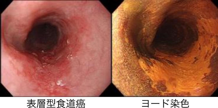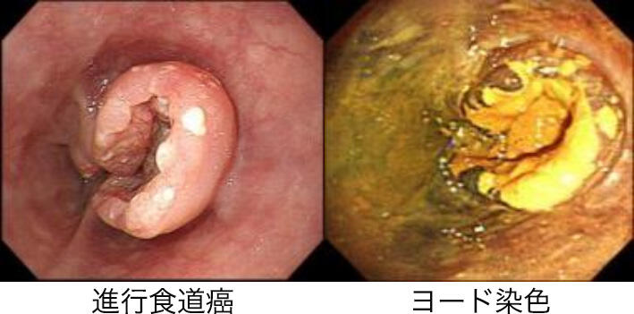 カメラで食道を観察し、病変の所在、広がり、狭窄、潰瘍の程度を評価します、色素(ヨード)で染色は早期の癌を見つけるのに使用します。正常な食道粘膜は色素で茶色に染まりますが、癌は染まりません。NBI(narrow band imaging)という特殊光をモードを利用するのも早期病変を発見しやすくなります。