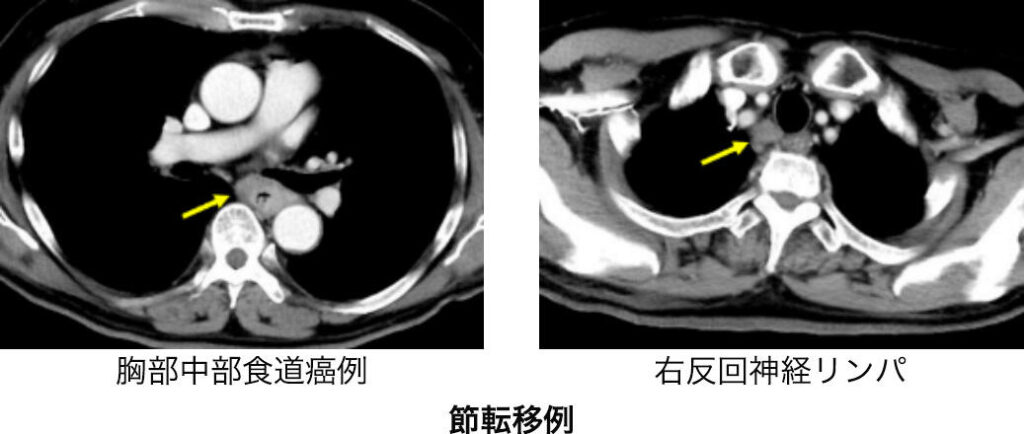CT(コンピューター断層撮影)で頸部から腹部までの撮影を行います。造影剤を併用することで血流のコントラストが鮮明となり診断能が高まります。食道癌の壁深達度がどうであるか、他臓器(気管、大動脈など)への浸潤はないか、食道周囲や遠くのリンパ節に転移がないか、肺や肝臓など他臓器に転移がないか、そして手術を検討するに解剖学的特徴について調べます。