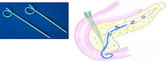 内視鏡治療で、膵管の中の膵石がはまり込んで取り出せないときに、体外衝撃波によって結石を割ってから膵石を取り出してステントを入れる方法です。これも施設によっては高い成功率が報告されています。