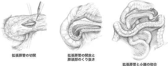 これらの治療で痛みが消えないときや、いったんは良くなったが再発するような場合、内視鏡治療や体外衝撃波の治療が最初から困難な場合には、手術治療が選択されます。特に、ステント治療では3か月おきにステントを入れ替える必要があり、ステントを抜いた後に痛みが再発することが多く、結局は手術になる場合が多いとされています。ステント交換など、反復する内視鏡治療は1-2年以内の期間に限って行うことが本邦のガイドラインでも提案されています。