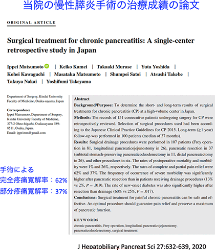 手術は、痛みをおさえること以外に、悪くなった膵臓のはたらき(外分泌機能と内分泌機能)をできるだけ維持する、あるいは悪化の進行を遅らせる効果も期待されています。また、繰り返す炎症をおこらなくすることにより、膵臓がんの発症を予防する効果も示されつつあります。