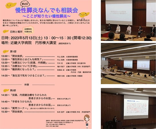 まず、アルコールが原因の方は、絶対に断酒が必要です。とはいっても、なかなか完全にはやめられないのも事実です。特に手術をした半年後あたりから、飲酒を再開してしまう患者さんがおられます。しかし、お酒を少しでも続けていると、たとえ手術によって痛みがなくなっていても、膵臓の破壊が進行して消化吸収不良と糖尿病が悪化していきます。どうしてもお酒を止められない場合には、断酒会などへの参加も一つの方法です。また、特発性膵炎の方は、一体どうして慢性膵炎になったのか不安に感じておられたり、遺伝性の有無などについてもご心配のことと思います。 私共の近畿大学では患者さんとご家族と共に、慢性膵炎について一緒に学ぶ、患者さんとの勉強会を行っています(図8)。このような会に参加して、お互いに悩みを共有して、前向きに病気に立ち向かっていくことも必要と思います。積極的なご参加をお待ちしています。
