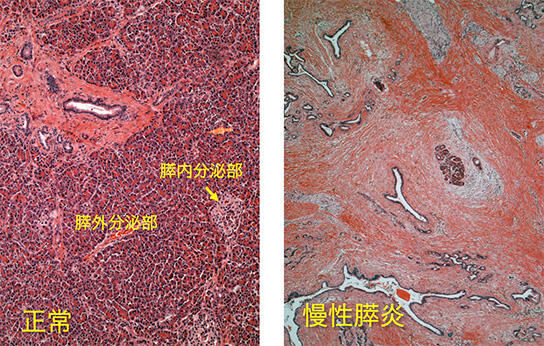 正常でみられる膵臓の外分泌部、内分泌部が、
