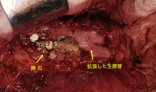 拡張した主膵管を切開したところ、内部に多数の膵石を認めた