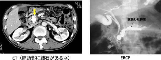 初期には、多くの場合では強い腹痛発作を繰り返します。進行すると消化吸収不良による下痢や体重減少、糖尿病が出現します。場合によっては、膵臓に石ができたり、膵管(膵液の通り道)が、太くいびつになったりすることがあります(図2)。このような状態になった慢性膵炎は元には戻らない(不可逆性)と考えられます。慢性膵炎になると膵癌の発症リスクが7 ~ 11 倍に上昇し、寿命も平均より10 年ほど短くなるといわれています。