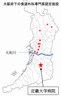 日本食道学会が認定する食道外科専門医認定施設は2023年4月現在全国で135施設ありますが、大和川以南の南大阪においては近畿大学病院が唯一認定されているのみです。この施設認定を得るためには食道外科専門医の常勤医の在籍が必須ですが、有資格者は全国でも僅か306名(2023年)です。大阪府下には28名の資格者がいますが、南大阪に限ると有資格者は近畿大学病院の2名のみです。