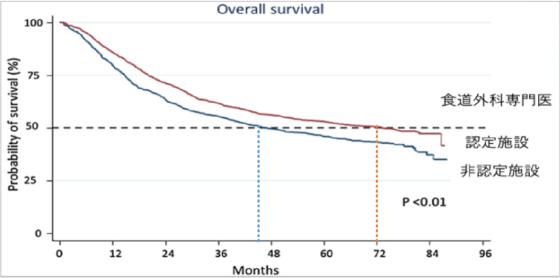 日本食道学会が実施した認定施設と非認定施設での治療成績の比較では、食道癌術後の生存期間中央値は75ヶ月vs.45か月と認定施設で大きな差を持って生存期間の延長が認められました。