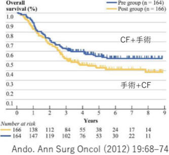 術前、全国的な臨床試験(JCOG1109)で、CF療法とDCF療法、さらに欧米の主流である術前CRTを比較したところ、DCF治療が有意性が証明され、DCF療法が現在の日本の推奨される術前化学療法となりました。 (Kato K at.al. Lancet. 2024 6;404:55-66.)