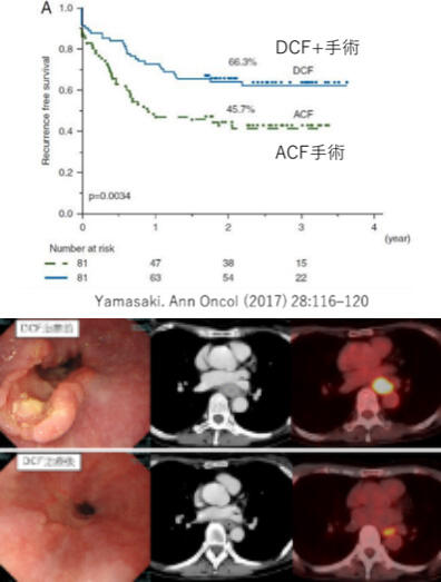 2010年から、近畿大学は大阪大学と共に、CF療法にドセタキセル(DTX)を加えた”DCF療法”を術前化学療法として開始し、臨床試験で60%という高い奏効率をもって予後を改善するという有用性を確認しました。(Shiraishi O et al. Oncology. 2017; 92:101-108 Yamasaki M et al. Ann Oncol. 2017 1;28:116-120 )
